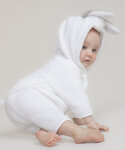 Hooded all-in-one in super-soft plush fabric with rabbit ears, eyes, and nose detailed on the hood. YKK zip down the centre front and down the leg. Tail detail on the back. Binding on sleeve and leg hems.